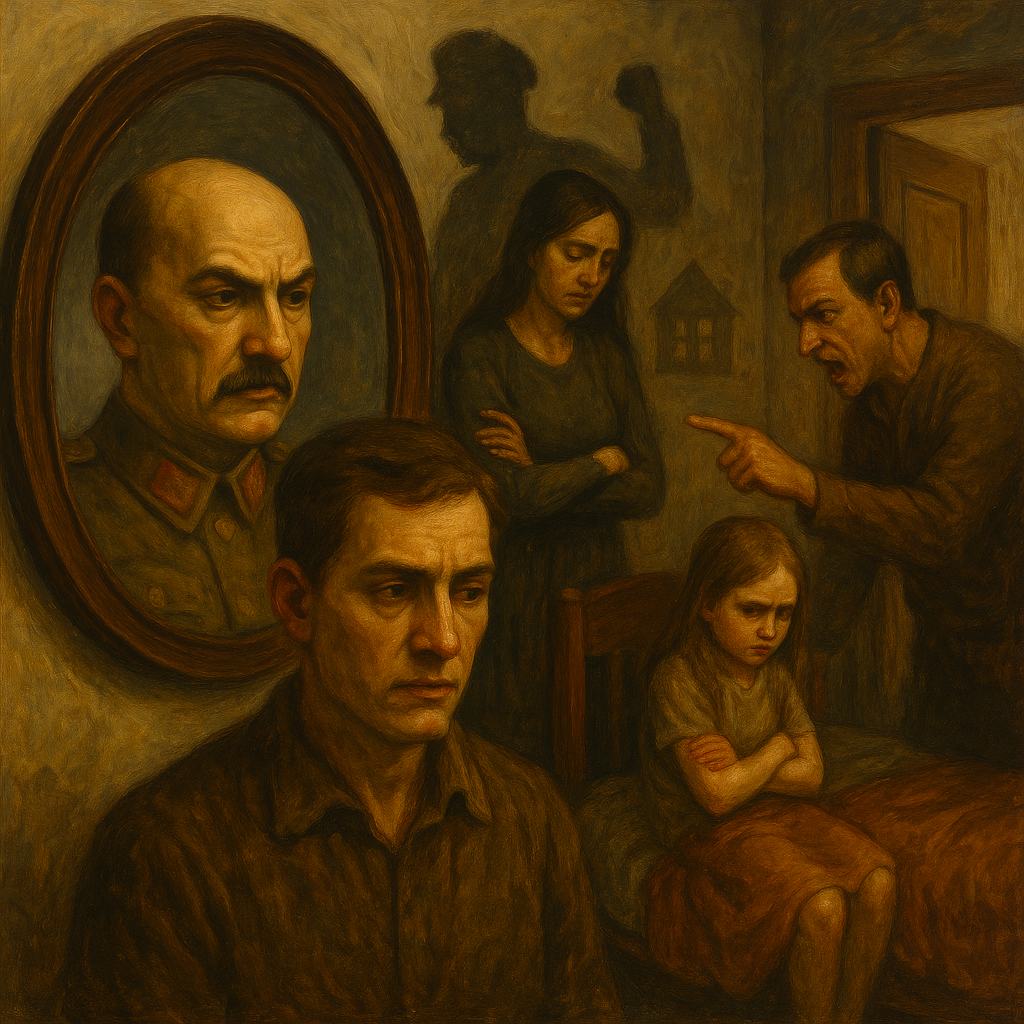 ديكتاتورى از وقتى آغاز مىشود كه فرزند خانواده مىرنجد از باز شدن بیاجازه و ناگهانی در اتاقش، اما اعتراض او با خشونت و تهمت و توهين پاسخ داده مىشود.